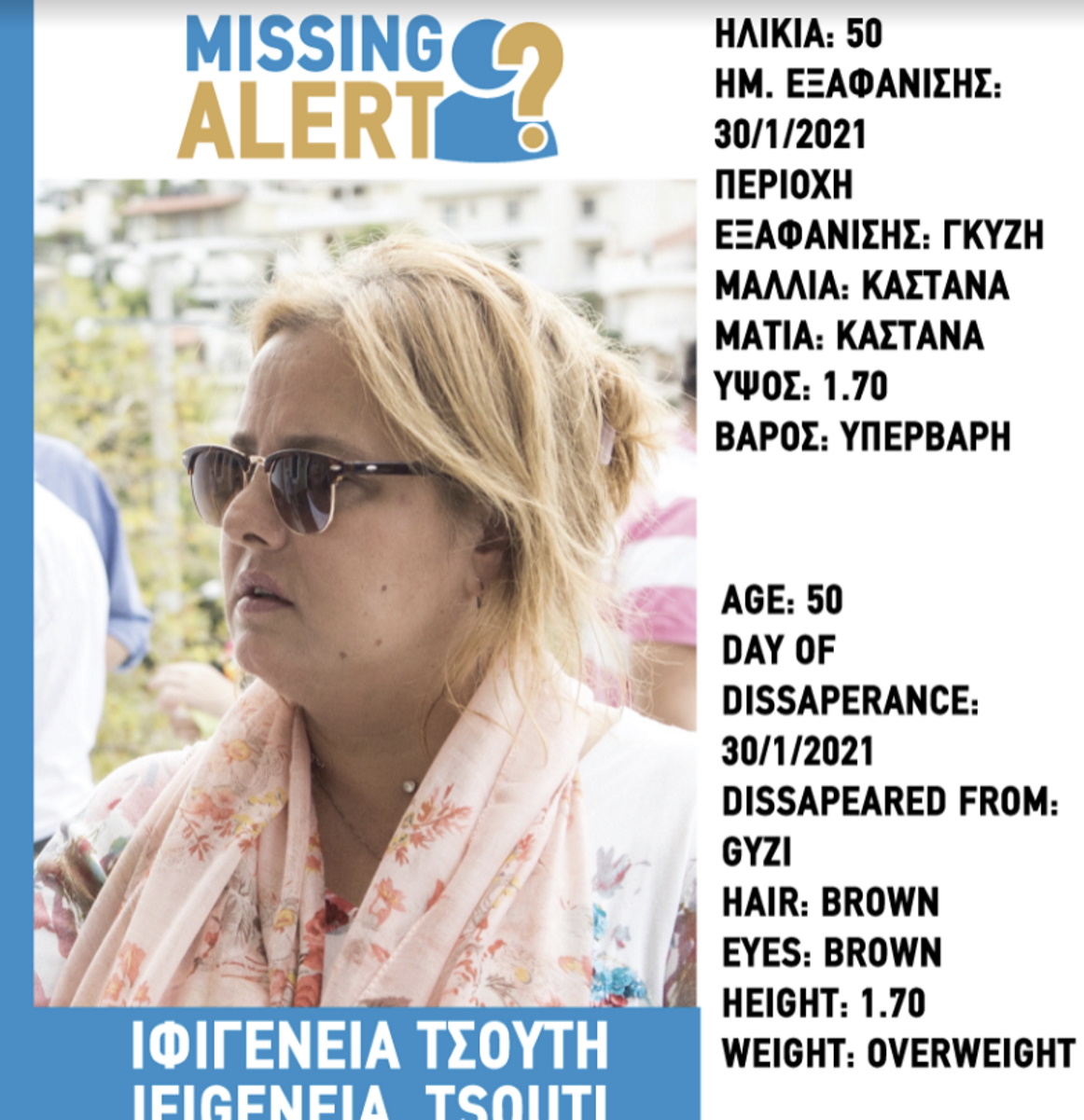 (Αρχικό κείμενο) Όπως αναφέρει το «Χαμόγελο του Παιδιού», στις 30/1/2021 εξαφανίστηκε από την περιοχή του Γκύζη, η Τσούτη Ιφιγένεια, 50 ετών. Το «Χαμόγελο του Παιδιού» ενημερώθηκε σήμερα, Δευτέρα (15.02.2021) για την εξαφάνιση και