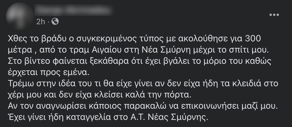 Όπως αναφέρει η νεαρή γυναίκα στην ανάρτησή της «χθες το βράδυ ο συγκεκριμένος τύπος με ακολούθησε για 300 μέτρα, από το τραμ Αιγαίου στη Νέα Σμύρνη μέχρι το σπίτι μου. Στο βίντεο φαίνεται ξεκάθαρα ότι έχει βγάλει το μόριο του καθώς έρχεται προς εμένα.