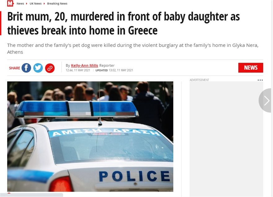 Νεαρή μητέρα δολοφονήθηκε μπροστά στην κορούλα της στην Ελλάδα, είναι ο τίτλος της ιστοσελίδας «euroweeklynews».