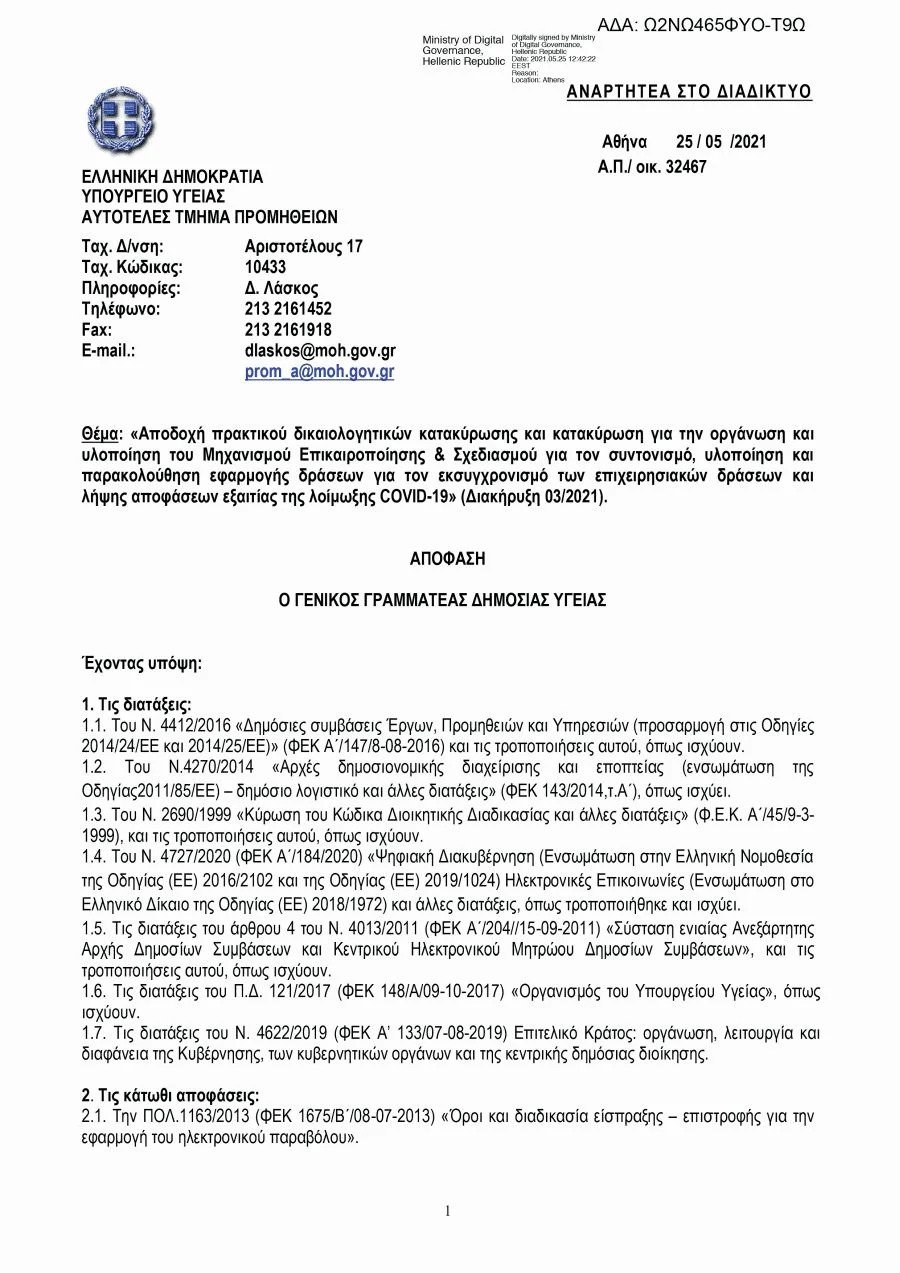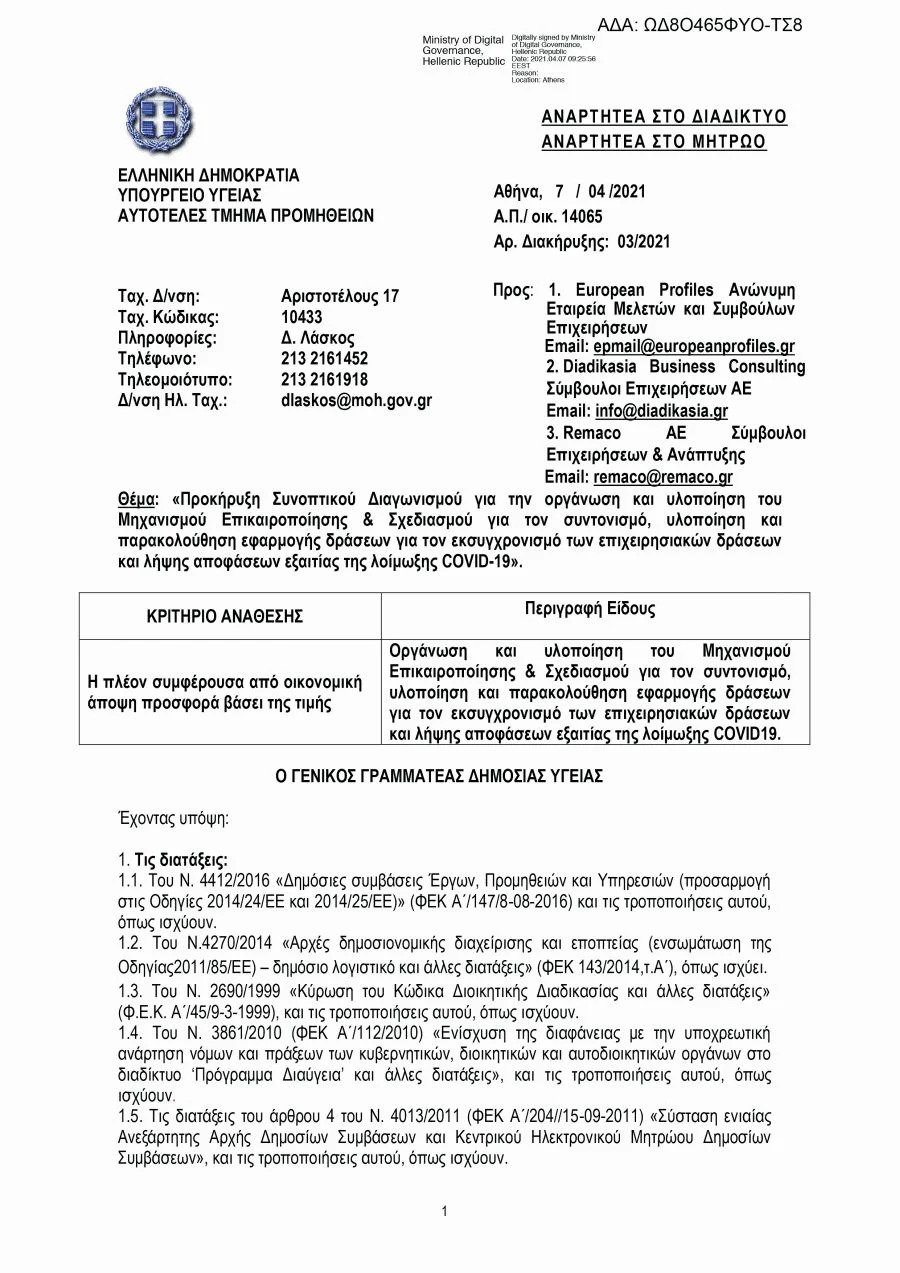 Το υπουργείο Υγείας επικύρωσε στις 31 Μαΐου 2021 ακόμα μία συνεργασία με ιδιωτική εταιρία, με αντίτιμο 58.000 ευρώ, για έργο που αφορά τόσο τη διαχείριση της πανδημίας όσο και τη διαχείριση προσωπικών δεδομένων.