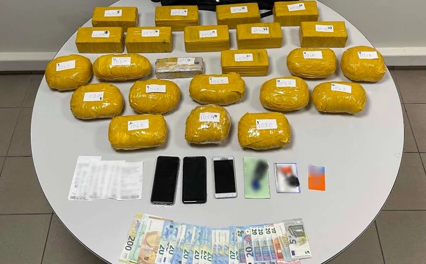 Σε έλεγχο που πραγματοποιήθηκε σε αυτοκίνητο που οδηγούσε ο 43χρονος, βρέθηκαν και κατασχέθηκαν δύο σακίδια πλάτης που περιείχαν συνολικά 23 δέματα ηρωίνης συνολικού βάρους 23.126 γραμμαρίων, τα οποία είχε παραλάβει νωρίτερα από τον 50χρονο μετά από συνάντηση που είχαν σε πάρκινγκ στην Εθνική Οδό Θεσσαλονίκης – Αθηνών.