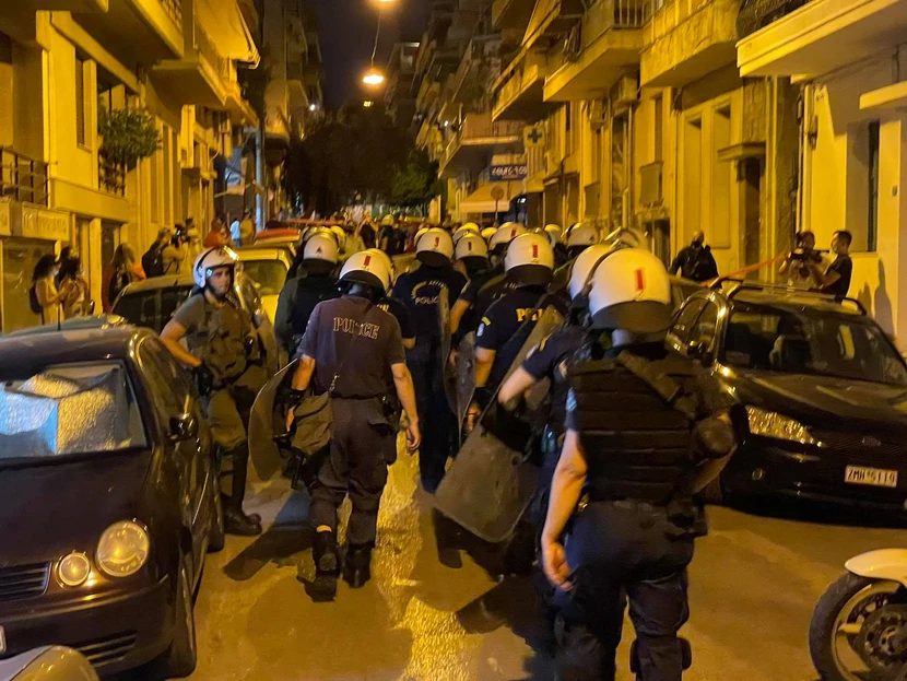 Οι αστυνομικοί που έφτασαν στο σημείο περίμεναν να εισβάλλουν στο σπίτι ενώ την ίδια στιγμή έσπευσαν στην περιοχή και 100 περίπου άτομα του αναρχικού χώρου οι οποίοι φώναζαν συνθήματα όπως καμιά γυναίκα μόνη.