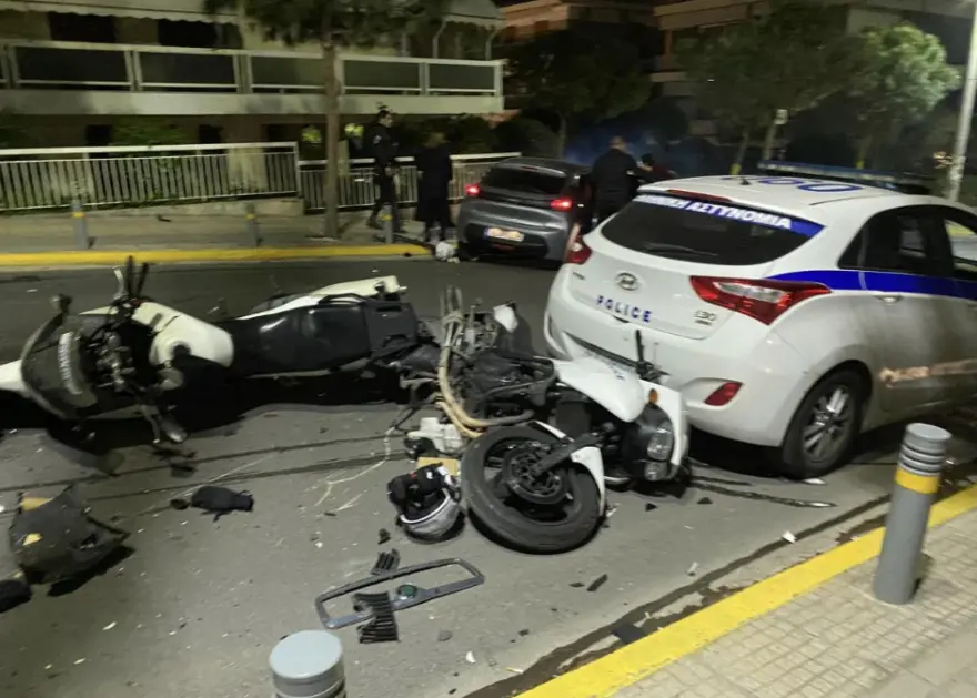 Σύμφωνα με το notia.gr ένα αυτοκίνητο που έτρεχε με υπερβολική ταχύτητα έπεσε πάνω σε δύο μοτοσικλέτες της ομάδας ΔΙΑΣ και ένα περιπολικό.