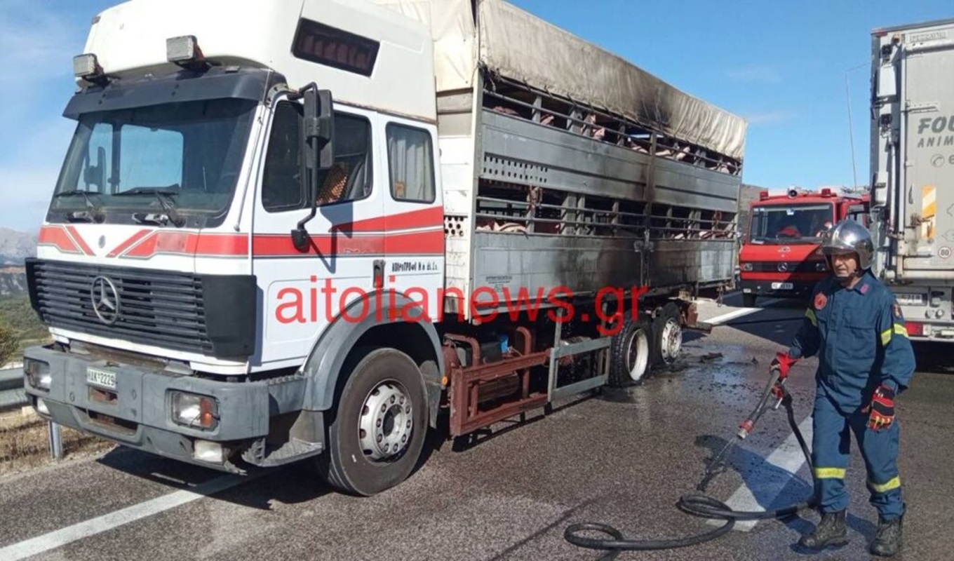 Φωτιά ξέσπασε σε νταλίκα, στην Ιόνια οδό, που μετέφερε ζώα. Συγκεκριμένα στο ύψος της λίμνης Αμβρακίας, κοντά στην Αμφιλοχία.