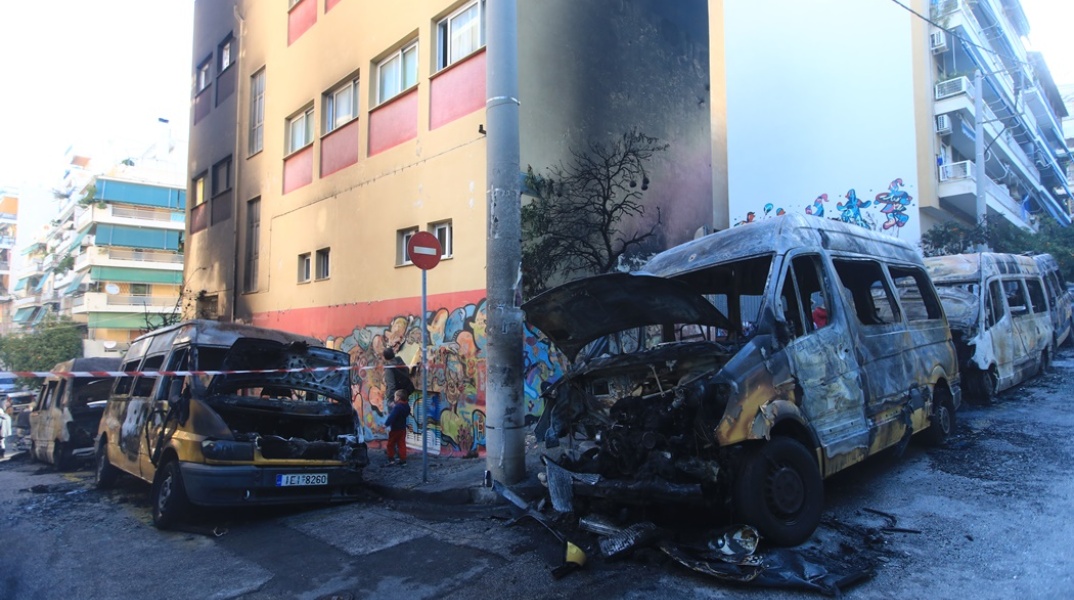 Η εμπρηστική επίθεση στου Ζωγράφου άφησε πίσω της καμένα σχολικά λεωφορεία ενώ προκλήθηκαν ζημιές και στο κτίριο που βρίσκεται εκεί.