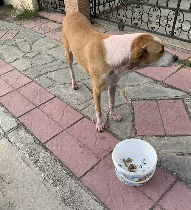 Αμέσως μετά είδε την αδέσποτη σκυλίτσα βαμμένη με ροζ μπογιά, να γλείφεται προσπαθώντας να απαλλαγεί από αυτή.