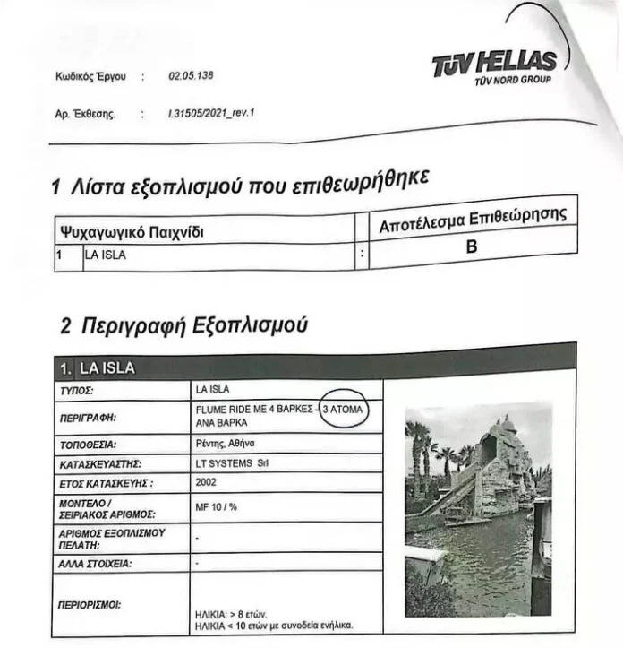 Σύμφωνα με το δελτίο τύπου της TUV HELLAS (ιδιωτική εταιρεία ελέγχου και ασφάλειας), που αναφέρει ξεκάθαρα πως στο βαρκάκι που έγινε το ατύχημα, πρέπει να μπαίνουν μέχρι 3 άτομα. Η έκθεση χαρακτηριστικά αναφέρει: