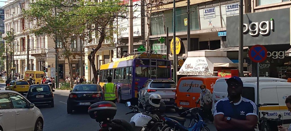 Ατύχημα με τρόλεϊ και τουριστικό λεωφορείο σημειώθηκε στην Πανεπιστημίου το μεσημέρι της Δευτέρας (15/4) λίγο μετά τις 15:00.