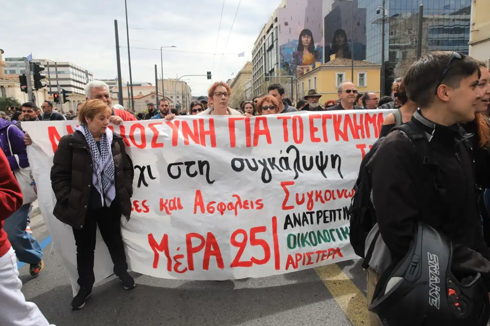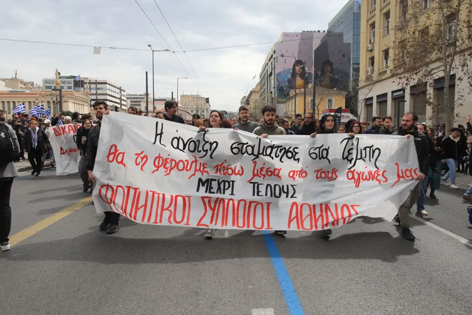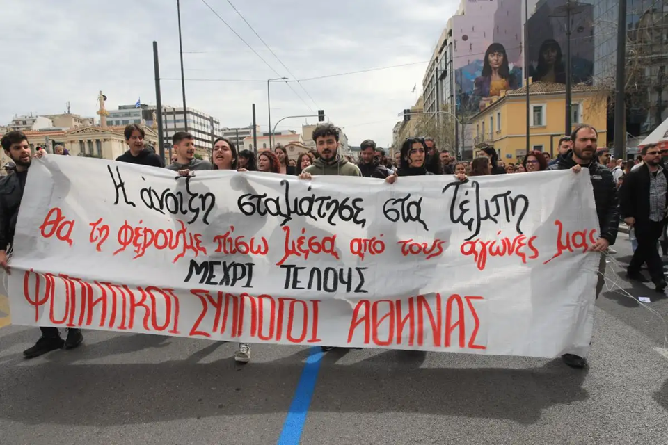 «Η άνοιξη σταμάτησε στα Τέμπη θα τη φέρουμε πίσω μέσα από τους αγώνες μας» έγραφε πανό που κρατούσαν φοιτητές με τη λήξη της στρατιωτικής παρέλασης το μεσημέρι της Τρίτης (25.3.25).