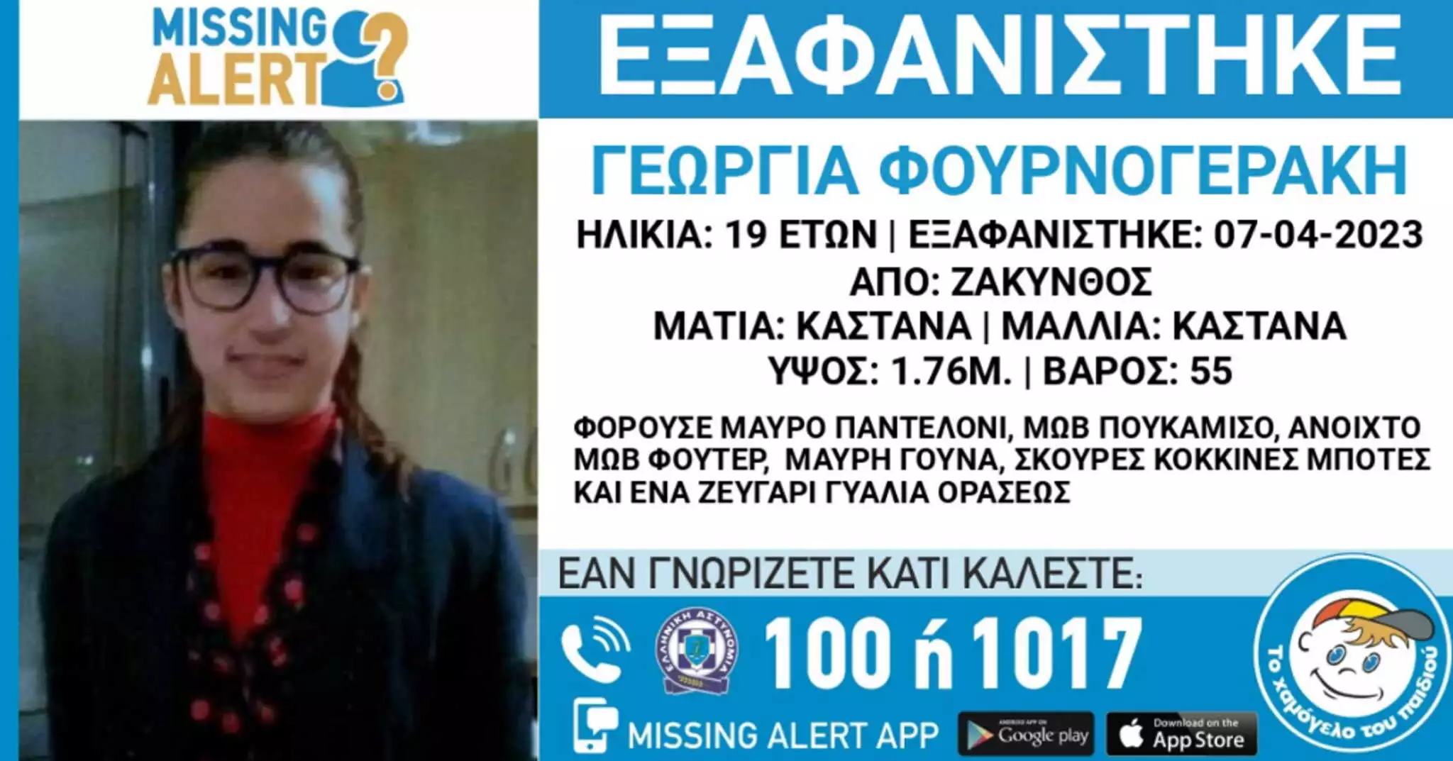 Σύμφωνα με το «Χαμόγελο του Παιδιού» για την εξαφάνιση της Γεωργίας Φουρνογεράκη, τα ίχνη της 19χρονης χάθηκαν στη Ζάκυνθο στις 7 Απριλίου. Το «Χαμόγελο του Παιδιού» ενημερώθηκε για την εξαφάνιση τη Μεγάλη Δευτέρα, 10 Απριλίου και «άμεσα προχώρησε στη δημοσιοποίηση των στοιχείων της ενήλικης κατόπιν αιτήματος των οικείων της, καθώς ενδέχεται να συντρέχουν σοβαροί λόγοι, οι οποίοι θέτουν τη ζωή της σε κίνδυνο.