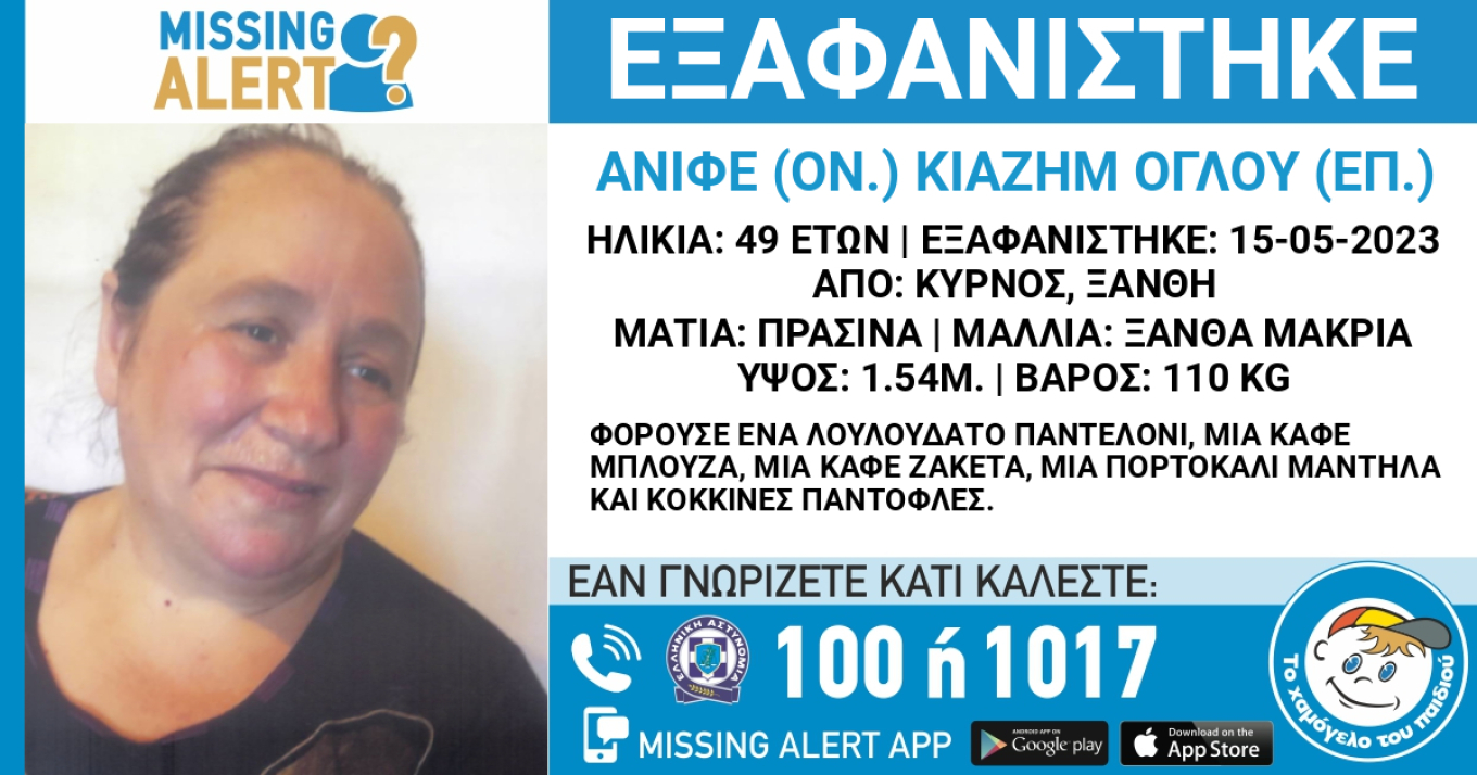 Εξαφανίστηκε από την περιοχή του Κύρνου Ξάνθης, το μεσημέρι της περασμένης Δευτέρας 15 Μαΐου, η 49χρονη Ανιφέ Κιαζήμ Ογλού.