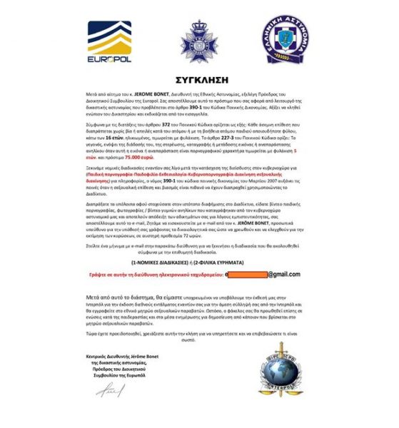 Πιο αναλυτικά, οι δράστες, σε επιστολή δήθεν αρμόδιων ελεγκτικών αρχών, προσπαθούν να εξαπατήσουν πολίτες – χρήστες του διαδικτύου, με το πρόσχημα ότι ο αποδέκτης τους εμπλέκεται σε υπόθεση πορνογραφίας και άλλων αδικημάτων, επισημαίνοντας μάλιστα ότι τέτοιου είδους αδικήματα επιφέρουν ποινή φυλάκισης 5 ετών και πρόστιμο ύψους 75.000 ευρώ.