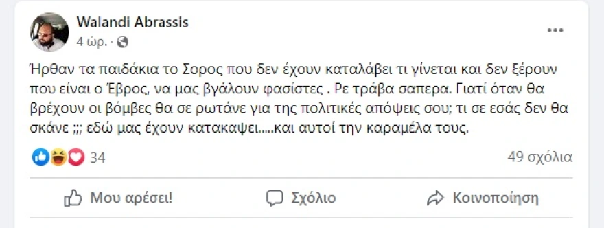 Ωστόσο, σε νεότερη ανάρτησή του μιλά για «τα παιδάκια του Σόρος» που «δεν ξέρουν πού είναι ο Έβρος» και ήρθαν να τους «βγάλουν φασίστες».