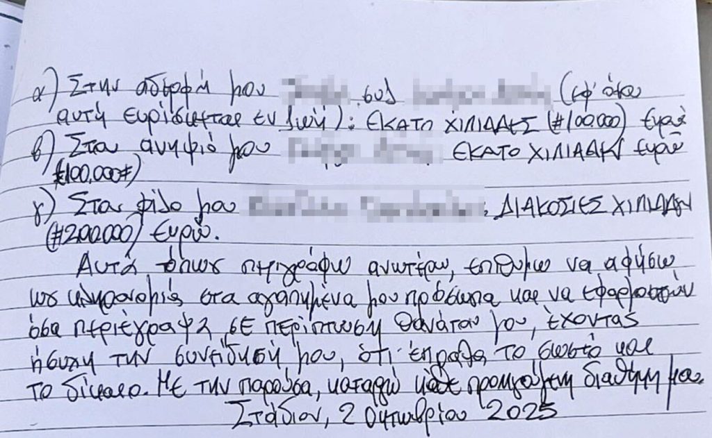 Η τελευταία διαθήκη του 68χρονου συντάχθηκε τρεις μέρες πριν τη δολοφονία του και σε αυτή αφήνει το μεγαλύτερο μέρος της περιουσίας του στον αγαπημένο του ανιψιό, ο οποίος υπήρξε και μάρτυρας του διπλού φονικού.
