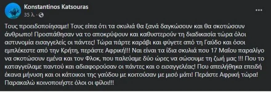 Τώρα πάρτε καράβι και φύγετε από τη Γαύδο και όσοι εμπλέκεστε από την Κρήτη, περάστε Αφρική!!! Ναι είναι τα ίδια σκυλιά που 17 Μαΐου παραλίγο να σκοτώσουν εμένα και τον Φλοκ, που παλεύαμε δύο ώρες να σώσουμε τη ζωή μας!!!