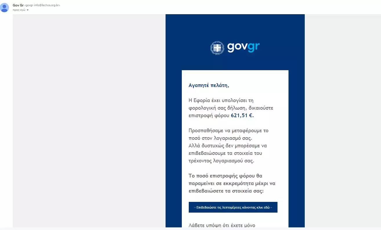 Μια νέα απάτη άρχισε να κυκλοφορεί στο διαδίκτυο μέσω email, με δήθεν αποστολέα το «gov.gr», μέσω της οποίας οι επιτήδειοι προσπαθούν να τραβήξουν χρήματα από ανυποψίαστους πολίτες, με την πρόφαση ότι «δικαιούνται επιστροφή χρημάτων».