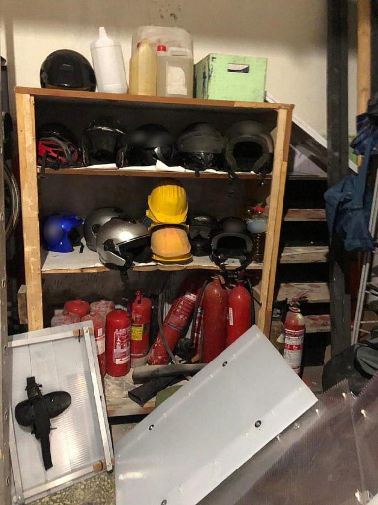 Σε έρευνα που πραγματοποιήθηκε στο χώρο του κτιρίου βρέθηκαν και κατασχέθηκαν πλήθος ξύλινων κονταριών, μεγάλος αριθμός κρανών δικυκλιστή, πυροσβεστήρες, πληθώρα αντιασφυξιογόνων μασκών, δοχεία με εύφλεκτο υγρό και αυτοσχέδιες ασπίδες.