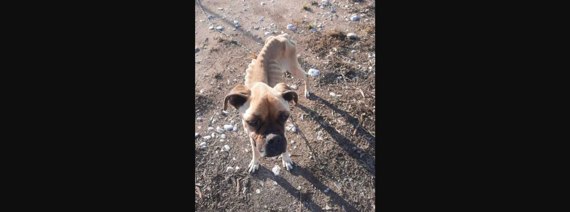 Ακριβώς απέναντι από την παραλία της περιοχής ένα θηλυκό σκυλί ράτσας Boxer δεμένο με χοντρή αλυσίδα. Για την ακρίβεια ένα δείγμα σκυλιού καθώς το ζώο είναι κυριολεκτικά κόκκαλα και δέρμα. Όταν το σηκώσαμε για να το πάρουμε η αλυσίδα του ήταν πιο βαριά από το ίδιο το σκυλί. Καλέσαμε άμεσα την αστυνομία και αυτή τη στιγμή είμαστε στο τμήμα.