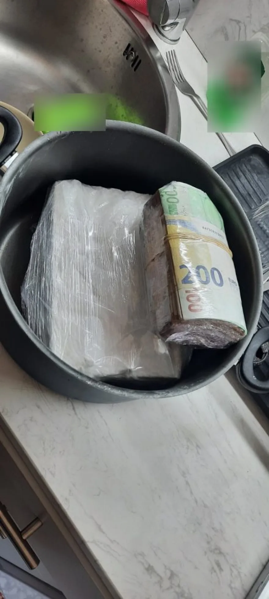 Στον απορροφητήρα του διαμερίσματος οι αστυνομικοί βρήκαν κρυμμένα χαρτονομίσματα τα οποία ήταν μέσα σε νάυλον συσκευασίες καθώς επίσης και μέσα σε κατσαρόλες. Επιμελώς κρυμμένα ήταν και τα ναρκωτικά. Περίπου ένα κιλό κοκαΐνης και δύο κιλά κάνναβης.