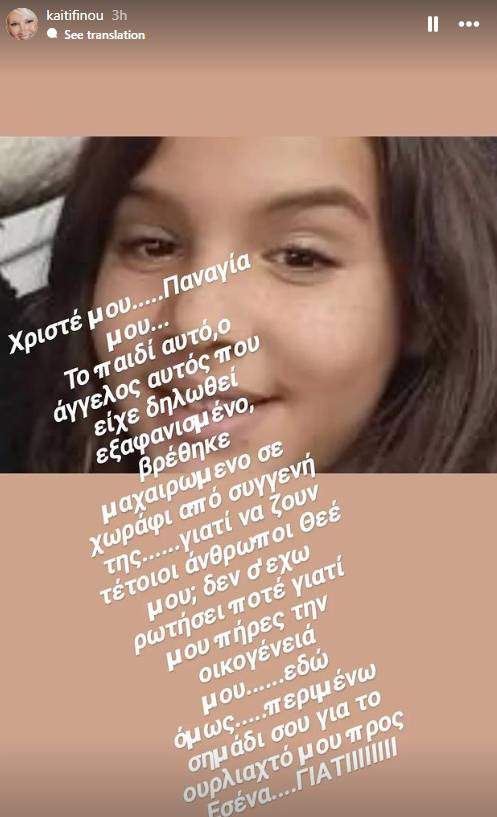 Η Καίτη Φίνου με ανάρτησή της στα μέσα κοινωνικής δικτύωσης, ξέσπασε για τη δολοφονία της 11χρονης από τον 37χρονο θείο της στον Πύργο.