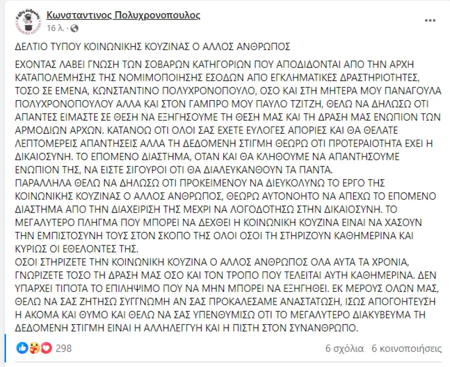 Ο «Άλλος Άνθρωπος», Κωνσταντίνος Πολυχρονόπουλος, μέσω μιας ανάρτησης στο προσωπικό του λογαριασμό στο Facebook ανακοίνωσε ότι για να διευκολύνει το έργο της κοινωνικής κουζίνας, θα απέχει από τη διαχείρισή της έως ότου λογοδοτήσει στη Δικαιοσύνη, για τις κατηγορίες για ξέπλυμα μαύρου χρήματος και σύσταση εγκληματικής οργάνωσης.