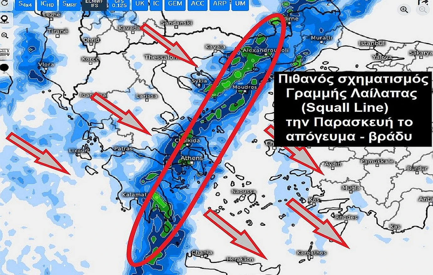 Ιδιαίτερη προσοχή απαιτεί η αυξημένη πιθανότητα σχηματισμού γραμμής λαίλαπας (squall line) τις απογευματινές και βραδινές ώρες της Παρασκευής. Πρόκειται για οργανωμένο σύστημα καταιγίδων σε γραμμική διάταξη, το οποίο στα ραντάρ εμφανίζεται ως ζώνη υψηλής ανακλαστικότητας λόγω έντονων υετικών φαινομένων.