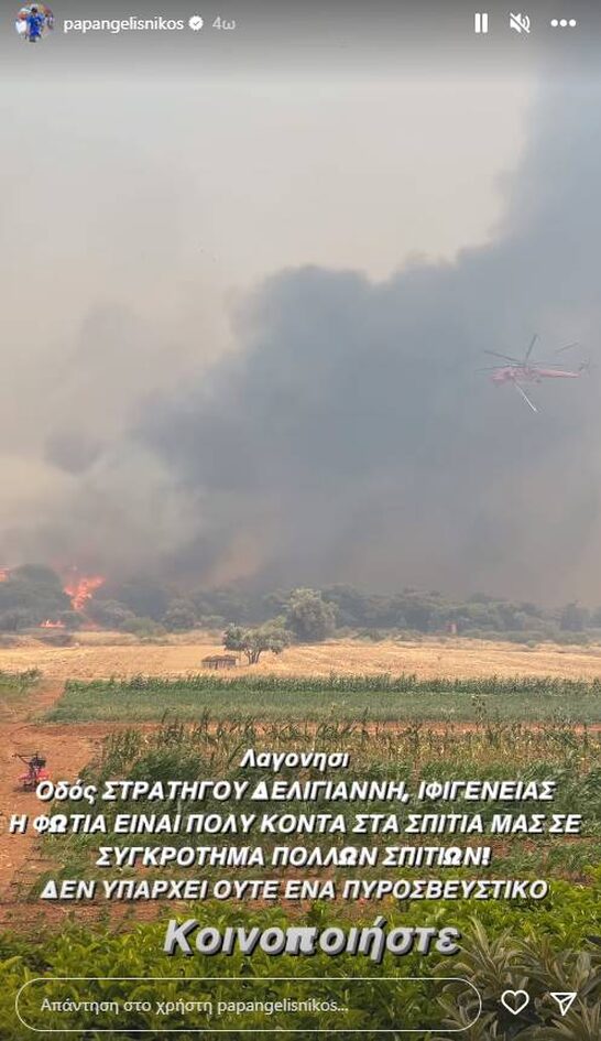 Ο Παπαγγελής με ανάρτηση του στα social media μετέφερε τη δραματική κατάσταση, γράφοντας μεταξύ άλλων ότι: «Δυστυχώς κάηκαν αρκετά σπίτια δίπλα από εμάς! Για άλλη μια φορά δεν ήμασταν προετοιμασμένοι… Δεν ξέρω ποιος φταίει ή ποιος θα πάρει την ευθύνη! Καλή δύναμη στους ανθρώπους που μάχονται με τη φωτιά και σε αυτούς που έχασαν τους κόπους μιας ζωής!»
