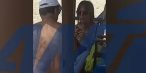 Η 59χρονη φαίνεται πως κάθεται σε ένα παραλιακό μαγαζί μαζί με τον σύζυγό της, και τρώει. Φοράει σκούρο μαγιό και γυαλιά ηλίου, ενώ δείχνει ήρεμη καθώς συνομιλεί με τον άνδρα της, που φορά λευκό καπέλο.