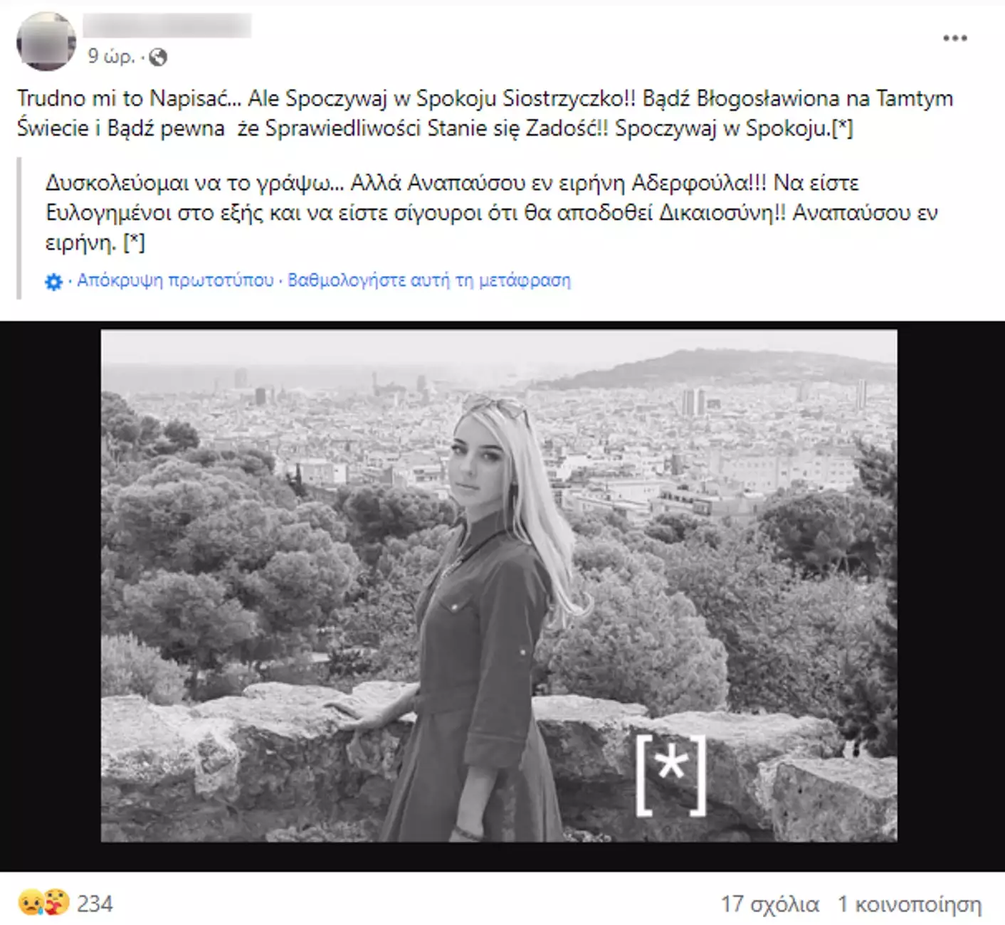 Την ίδια ώρα, και ο υπουργός Δικαιοσύνης της Πολωνίας ανέβασε στον προσωπικό του λογαριασμό στο twitter κείμενο για την 27χρονη Πολωνή, αναφέροντας ότι διετάχθη από τον ίδιο έρευνα για την εξιχνίαση της υπόθεσης της εγκληματικής ενέργειας -όπως όλα τα στοιχεία δείχνουν- ώστε να βρεθούν οι πραγματικοί ένοχοι.