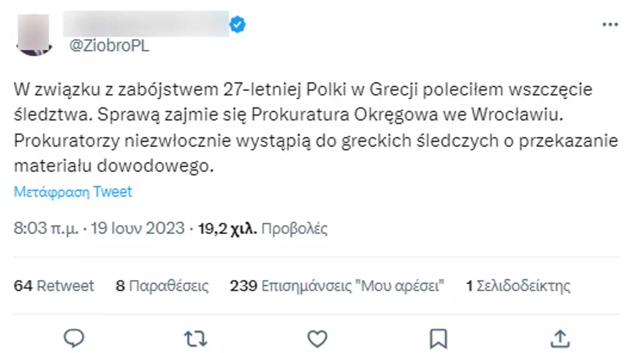 «Σε σχέση με τη δολοφονία μιας 27χρονης Πολωνής στην Ελλάδα, διέταξα έρευνα. Την υπόθεση θα χειριστεί η Επαρχιακή Εισαγγελία στο Βρότσλαβ. Οι εισαγγελείς θα ζητήσουν άμεσα στοιχεία από Έλληνες ανακριτές».