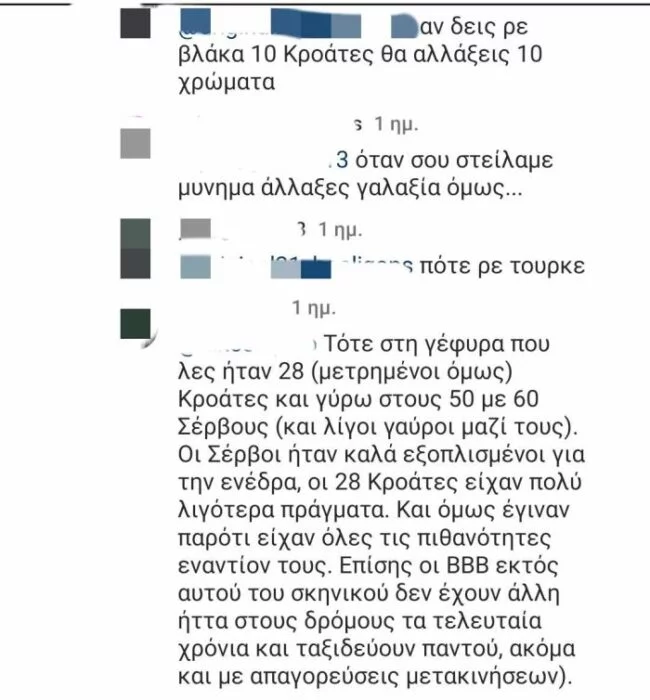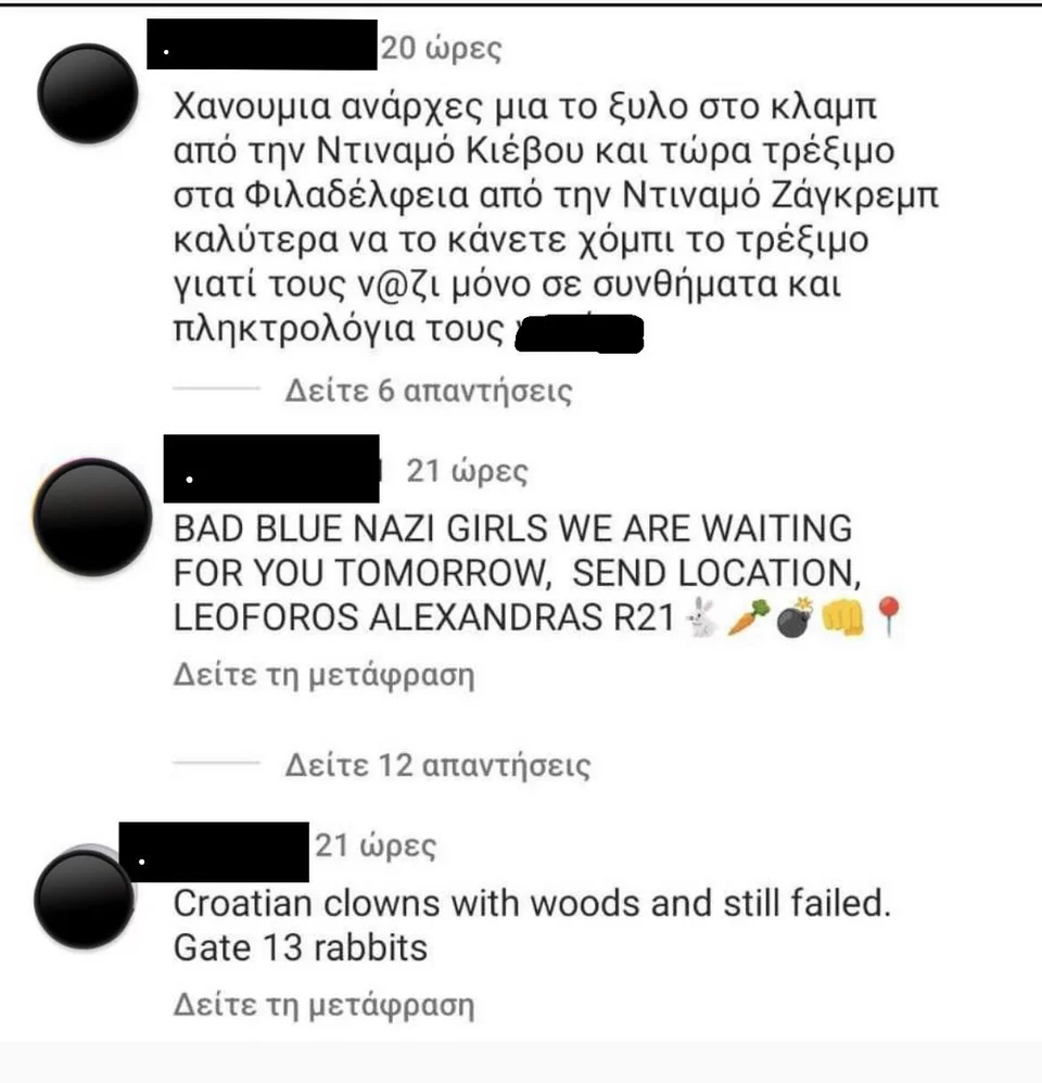 «Αν δεις ρε βλάκα 10 Κροάτες θα αλλάξεις 10 χρώματα». «Οι BBB (σ.σ.: Bad Blue Boys) εκτός αυτού του σκηνικού δεν έχουν άλλη ήττα στους δρόμους τα τελευταία χρόνια και ταξιδεύουν παντού, ακόμα και με απαγορεύσεις μετακινήσεων». «Γαλλίδες σας περιμένουμε». «Θα φας καμιά μαχαιριά αύριο μικρέ θα τρέχεις». Ένα ελάχιστο δείγμα γραφής των ανεγκέφαλων εγκληματιών που δεν έχουν καμία σχέση με τα οπαδικά κινήματα, απλά ντύνονται τον μανδύα τους και προχωρούν στις εγκληματικές τους ενέργειες.