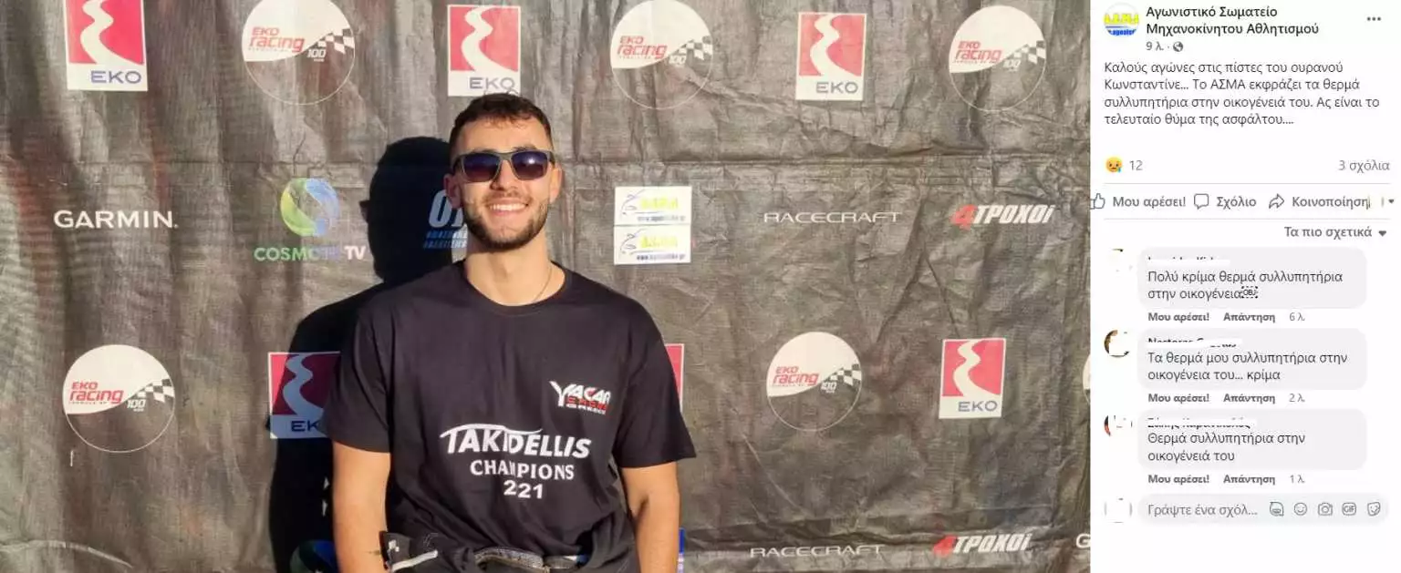Ρίγη συγκίνησης προκαλεί ο αποχαιρετισμός του Αγωνιστικού Σωματείου Μηχανοκίνητου Αθλητισμού στον 19χρονο Κώστα, ανεβάζοντας μία φωτογραφία του νεαρού, η οποία συνοδευόταν από την εξής ανάρτηση: «Καλούς αγώνες στις πίστες του ουρανού Κωνσταντίνε… Το ΑΣΜΑ εκφράζει τα θερμά συλλυπητήρια στην οικογένειά του. Ας είναι το τελευταίο θύμα της ασφάλτου….».