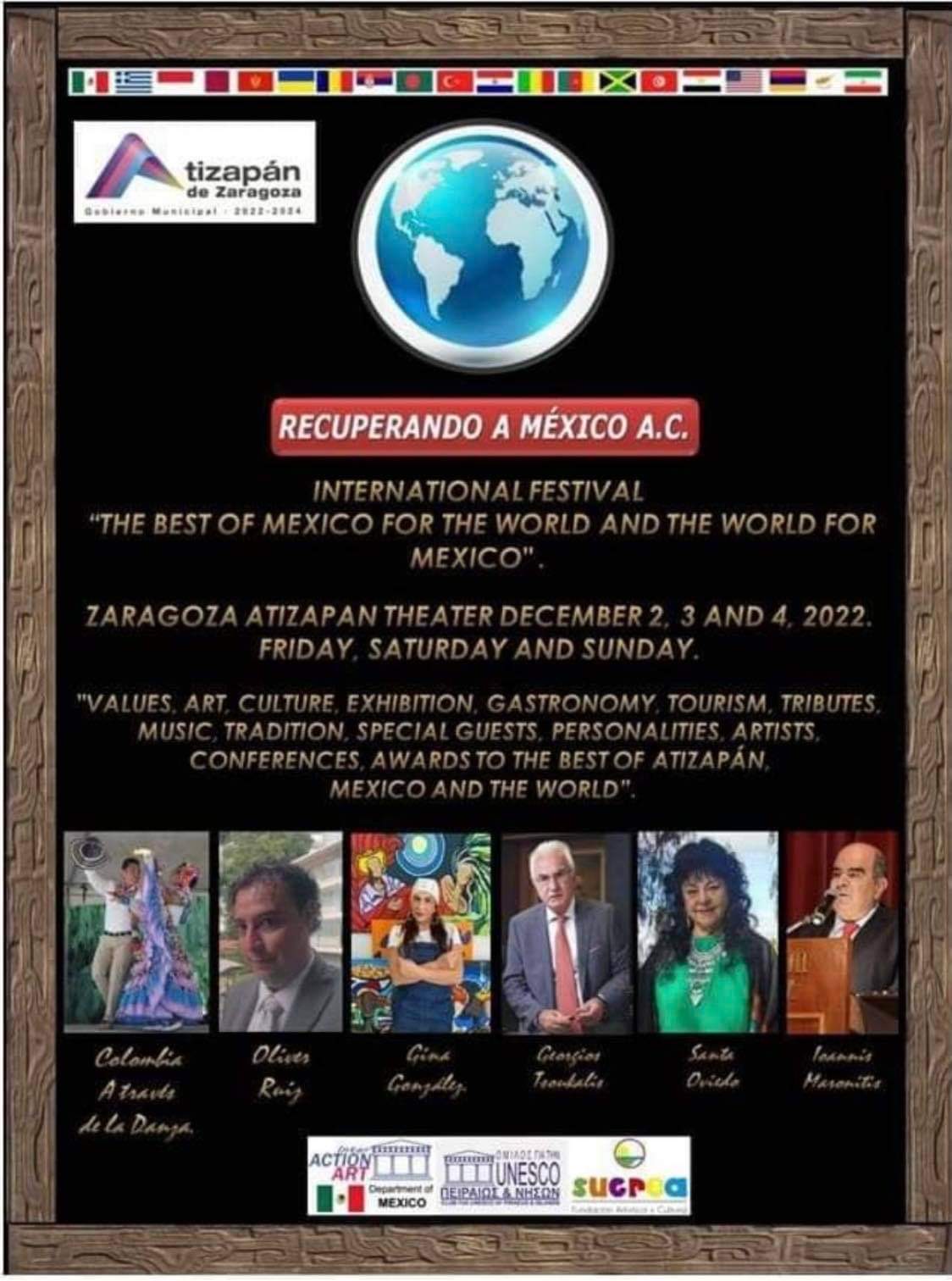 Η διεθνής αυτή διάκριση και βράβευση του οικουμενικού διώκτη της αρχαιοκαπηλίας θα γίνει σε ειδική εκδήλωση στο πλαίσιο του διεθνούς φεστιβάλ «Τα καλύτερα από το Μεξικό για τον κόσμο και ο κόσμος για το Μεξικό» το οποίο πραγματοποιείται από 2-4 Δεκεμβρίου 2022 στο θέατρο Zaragoza Atizapan στο Μεξικό.