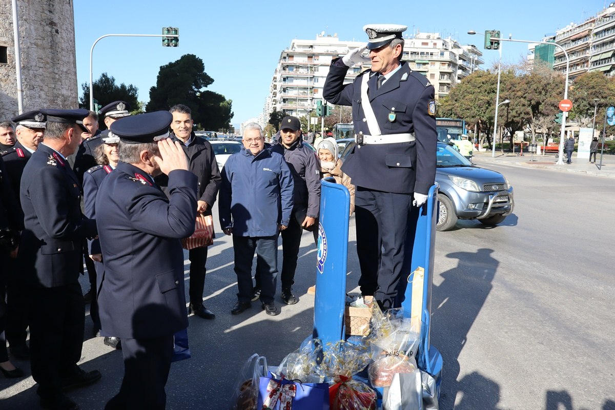 Ο γενικός συντονιστής αστυνομίας Βορείου Ελλάδος, αντιστράτηγος Γεώργιος Παπαδόπουλος και ο γενικός αστυνομικός διευθυντής Θεσσαλονίκης, υποστράτηγος Γεώργιος Τζήμας, αντάλλαξαν ευχές με το ρυθμιστή τροχονόμο της Διεύθυνσης Τροχαίας Θεσσαλονίκης και του προσέφεραν εθιμοτυπικά δώρα.