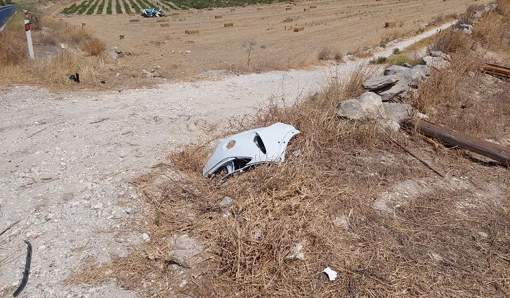Συνέχισε την τρελή, ανεξέλεγκτη πορεία του και τράκαρε κατόπιν σε κολώνα του ΟΤΕ, πήρε τούμπες, προσέκρουσε μετά σε τοιχίο και σταμάτησε μετά από 200 περίπου μέτρα πέφτοντας σε παρακείμενο του δρόμου κτήμα.