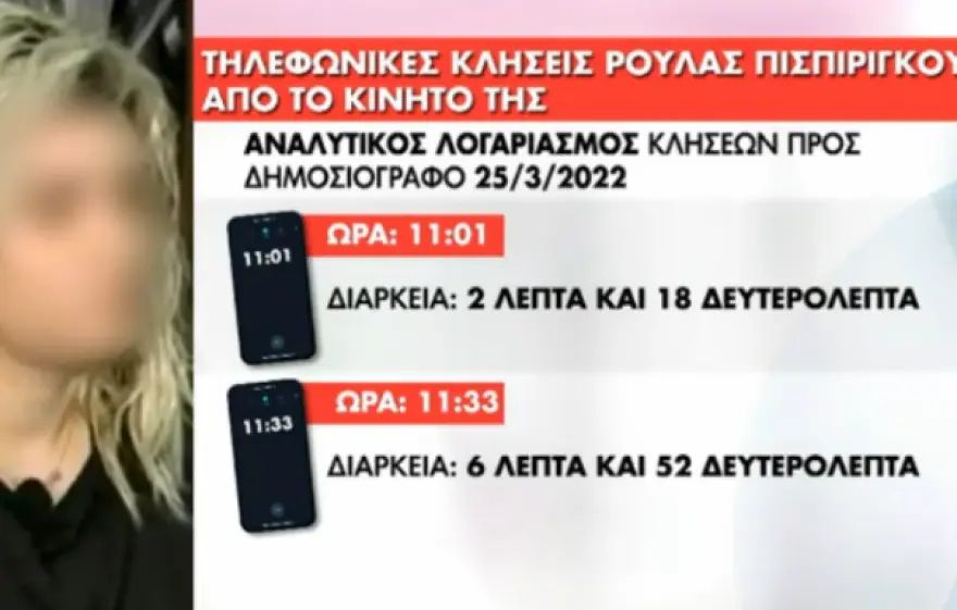 Σύμφωνα με το ρεπορτάζ του δημοσιογράφου προκύπτει ότι την 25η Μαρτίου από το κινητό της Ρούλας Πισπιρίγκου πραγματοποιούνται δυο εξερχόμενες κλήσεις προς το κινητό τηλέφωνο της δημοσιογράφου.
