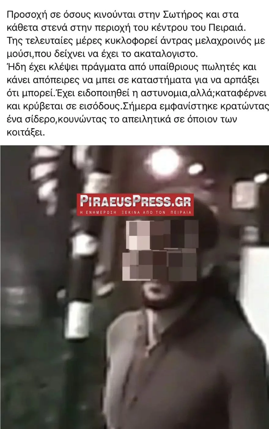 Οι κάτοικοι της περιοχής ανησυχούν, ενώ σύμφωνα με το «piraeus press», ο άνδρας φέρει και μεταλλικό αντικείμενο, ενώ παρουσιάζεται σαν να έχει το ακαταλόγιστο.