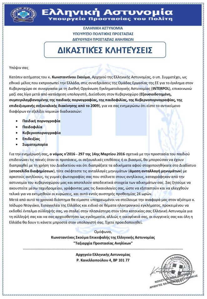 Συγκεκριμένα, οι δράστες χρησιμοποιώντας εκ νέου τα στοιχεία αυτά, σε επιστολή δήθεν αρμόδιων ελεγκτικών αρχών, με εντυπώματα της Ελληνικής Αστυνομίας και του Υπουργείου Προστασίας του Πολίτη, προσπαθούν να εξαπατήσουν πολίτες – χρήστες του διαδικτύου, με το πρόσχημα ότι βρίσκονται υπό έρευνα από αστυνομικές ή δικαστικές Αρχές για δήθεν υπόθεση παιδικής πορνογραφίας και άλλων αδικημάτων.