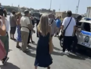 Το πλήθος φώναζε «είστε ανεπιθύμητοι στο νησί», ενώ προσπάθησε να βρει νέα διέξοδο για να πλησιάσει ξανά το λιμάνι, όπου το «Crown Iris» έχει ήδη καταπλεύσει στα ανοιχτά.