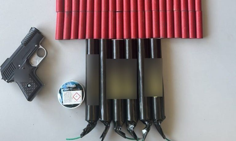 Κατά την έρευνα στο όχημα, βρέθηκαν και κατασχέθηκαν 206 κροτίδες, δύο πιστόλια εκτόξευσης φωτοβολίδων και μεταλλικά καψύλλια. Οι τρεις άνδρες συνελήφθησαν, καθώς, σύμφωνα με την αστυνομία, είχαν μόλις προμηθευτεί τα παράνομα αντικείμενα.