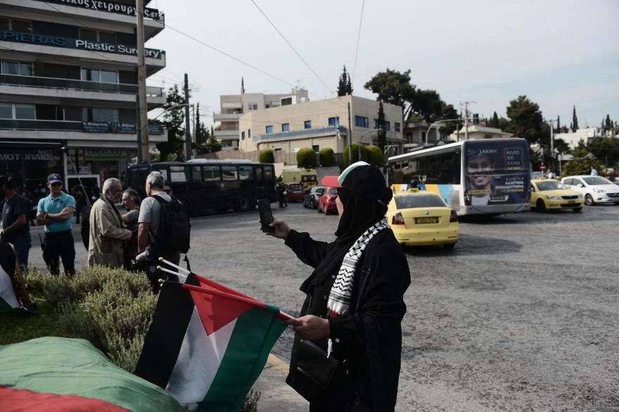 Πριν από τις 18:00 συγκεντρώθηκαν οι πρώτοι συμμετέχοντες στην πορεία με σημαίες της Παλαιστίνης και αφίσες με τη φωτογραφία της δημοσιογράφου που πυροβολήθηκε στο κεφάλι, την ώρα που κάλυπτε συγκρούσεις στη Τζενίν, στην κατεχόμενη Δυτική Όχθη.