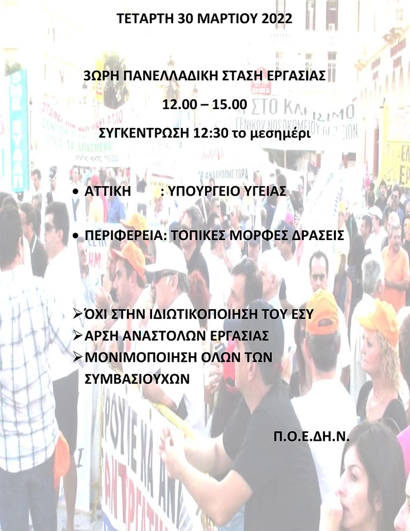 Σε τρίωρη στάση εργασίας από τις 12:00 – 15:00, προχωράει σήμερα Τετάρτη 30 Μαρτίου η ΠΟΕΔΗΝ.