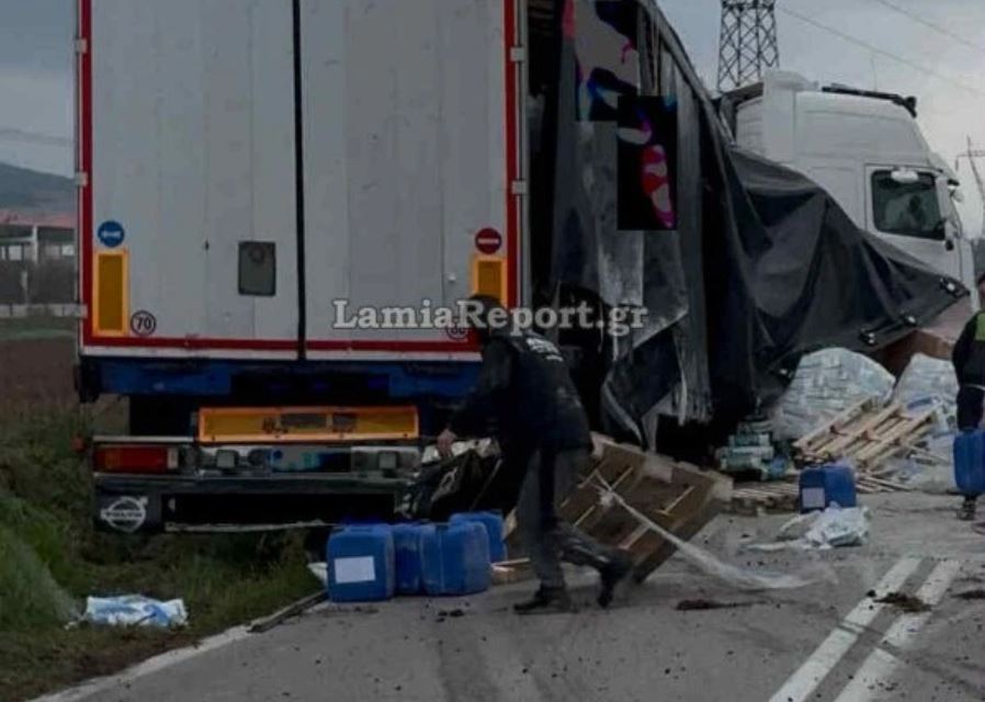 Σύμφωνα με το LamiaReport, νταλίκα φορτωμένη με τσιμέντα και ορυκτά έλαια – για άγνωστη προς το παρόν αιτία- εξετράπη της πορείας της με αποτέλεσμα να γεμίσει ο δρόμος με μέρος του φορτίου της.