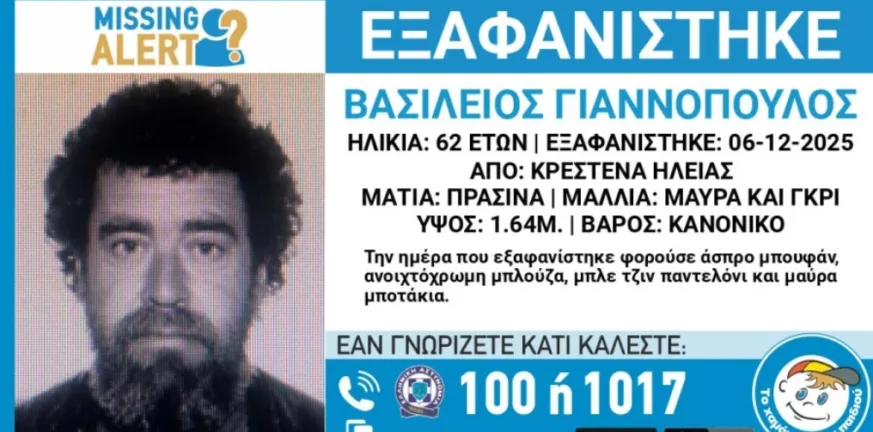 Στον 62χρονο Βασίλη Γιαννόπουλο – για τον οποίο είχε εκδοθεί mising alert- ανήκει η σορός που εντοπίστηκε το πρωί της Κυριακής (14/12), από κυνηγό σε δασική περιοχή ανάμεσα στο Γρύλλο και την Κρέστενα Ηλείας.