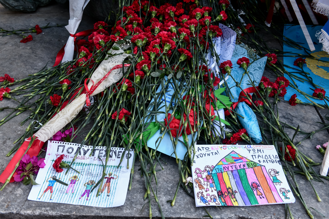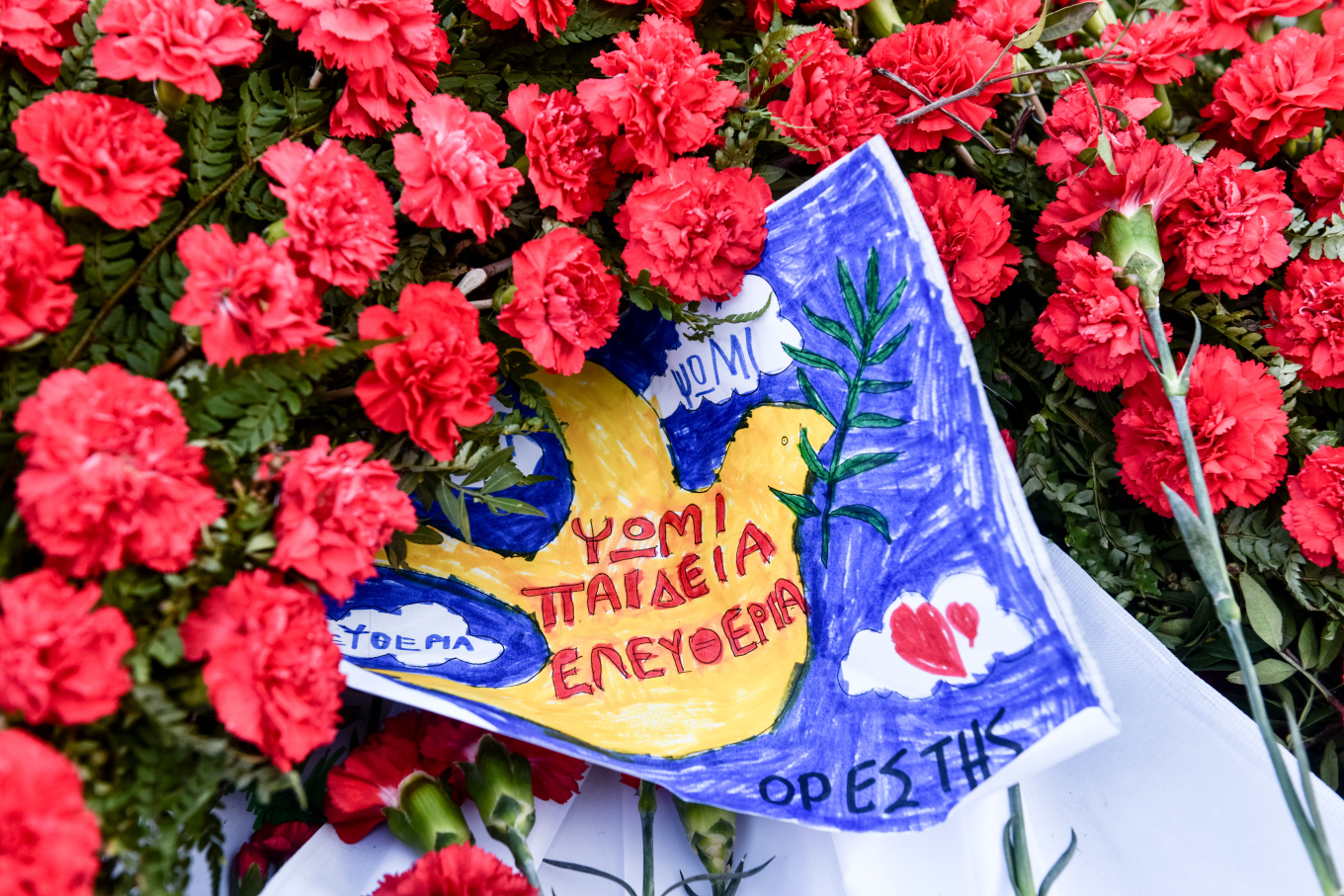 Κρατώντας λουλούδια και ζωγραφιές στα χέρια τους θέλουν να αποτίσουν φόρο τιμής στους αγωνιστές της εξέγερσης του Νοέμβρη του ’73. Κυρίαρχο στοιχείο στις παιδικές ζωγραφιές το πάντα επίκαιρο σύνθημα «Ψωμί – Παιδεία – Ελευθερία», καθώς επίσης και άλλα συνθήματα όπως «κάτω ο φασισμός» και «κάτω η χούντα».