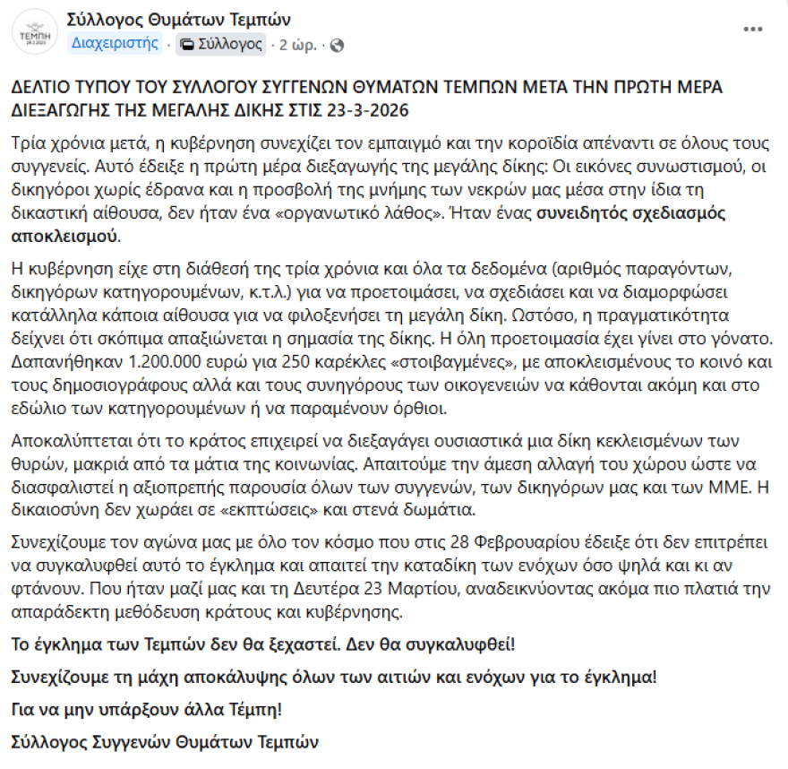 Ο σύλλογος συγγενών των θυμάτων ζητά τη μεταφορά της δίκης για το έγκλημα στα Τέμπη σε άλλη αίθουσα, καταγγέλλοντας ότι οι συνθήκες που επικρατούν δεν επιτρέπουν, όπως υποστηρίζει, μια αξιοπρεπή και διαφανή απονομή της Δικαιοσύνης.