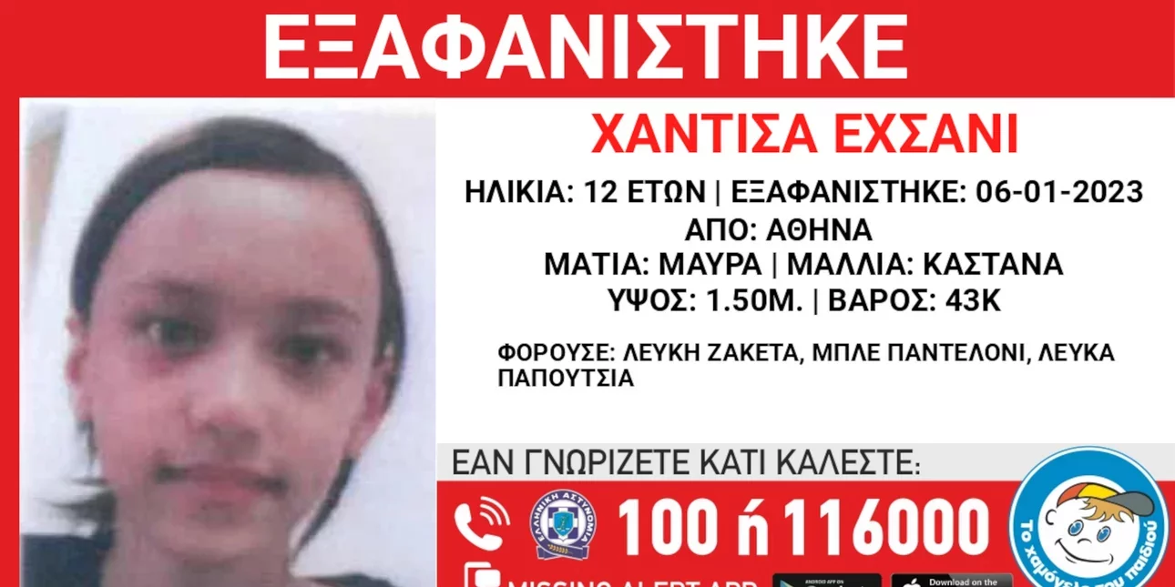 Συγκεκριμένα, ενεργοποιήθηκε Missing Alert για τη 12χρονη Χαντίσα Εχσανί, της οποία τα ίχνη χάθηκαν από την Παρασκευή (6/1) από την Αθήνα.