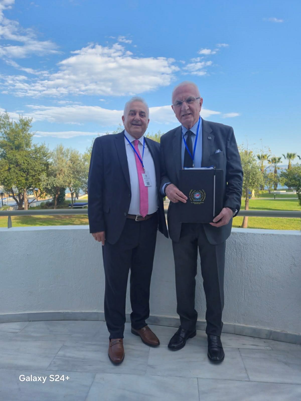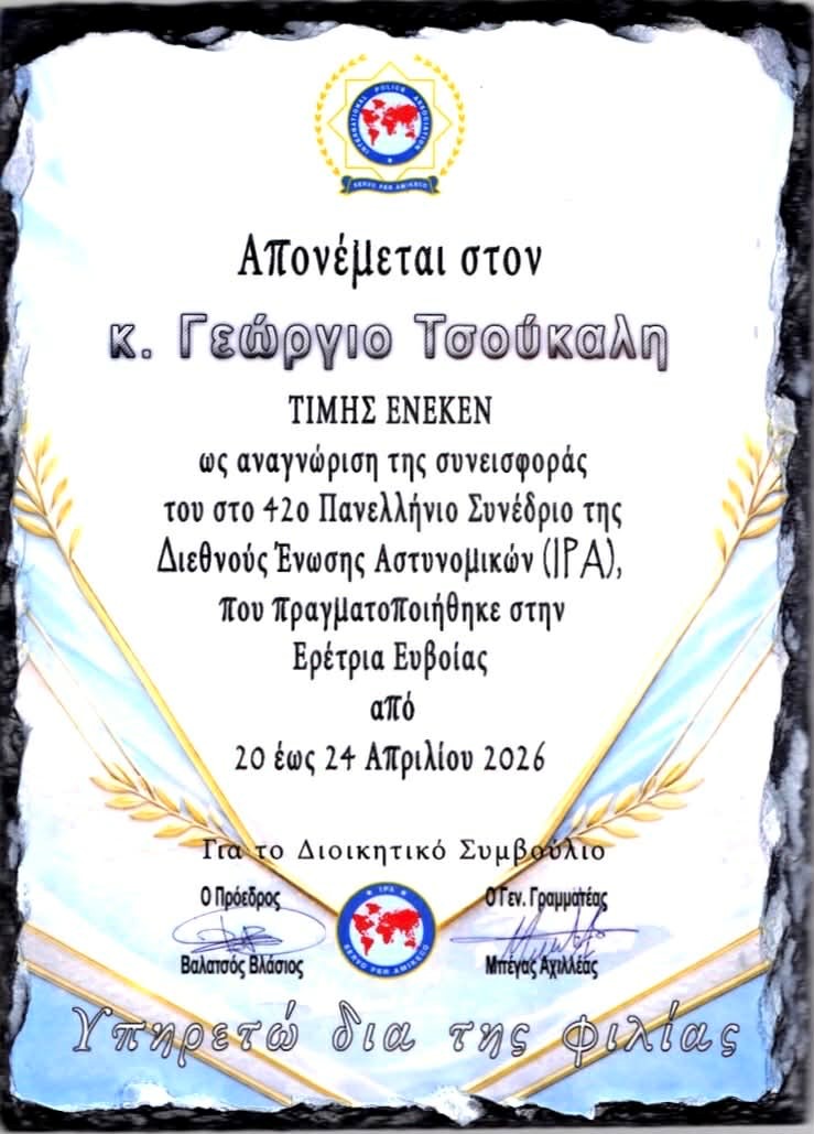 Μετά την ολοκλήρωση της ομιλίας του, ο Γιώργος Τσούκαλης τιμήθηκε από τον Πρόεδρο του Εθνικού Τμήματος IPA, Βλάσση Βαλατσό, με τιμητική πλακέτα για την προσφορά και το έργο του.