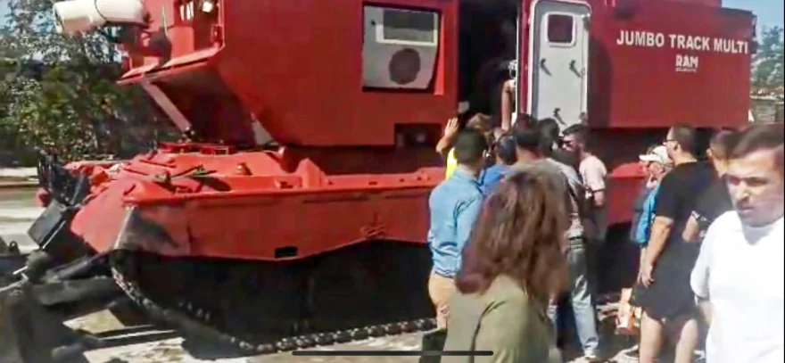 Το ιδιωτικό ερπυστριοφόρο «Jumbo Track Multi» των 35 τόνων, χρησιμοποιείται για τη μεταφορά κατοίκων από και προς τα σπίτια τους στη Γιάννουλη εξασφαλίζοντας την ασφαλή μεταφορά τους, και μάλιστα με τη συνοδεία ανδρών της ΕΜΑΚ.