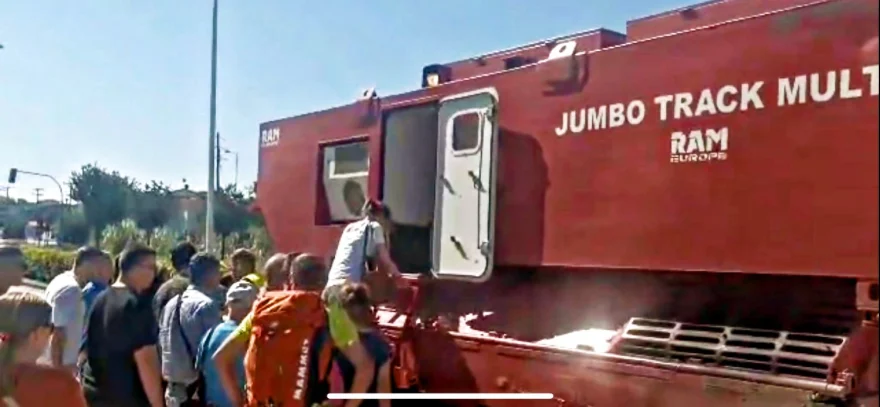 Το ιδιωτικό ερπυστριοφόρο «Jumbo Track Multi» των 35 τόνων, χρησιμοποιείται για τη μεταφορά κατοίκων από και προς τα σπίτια τους στη Γιάννουλη εξασφαλίζοντας την ασφαλή μεταφορά τους, και μάλιστα με τη συνοδεία ανδρών της ΕΜΑΚ.